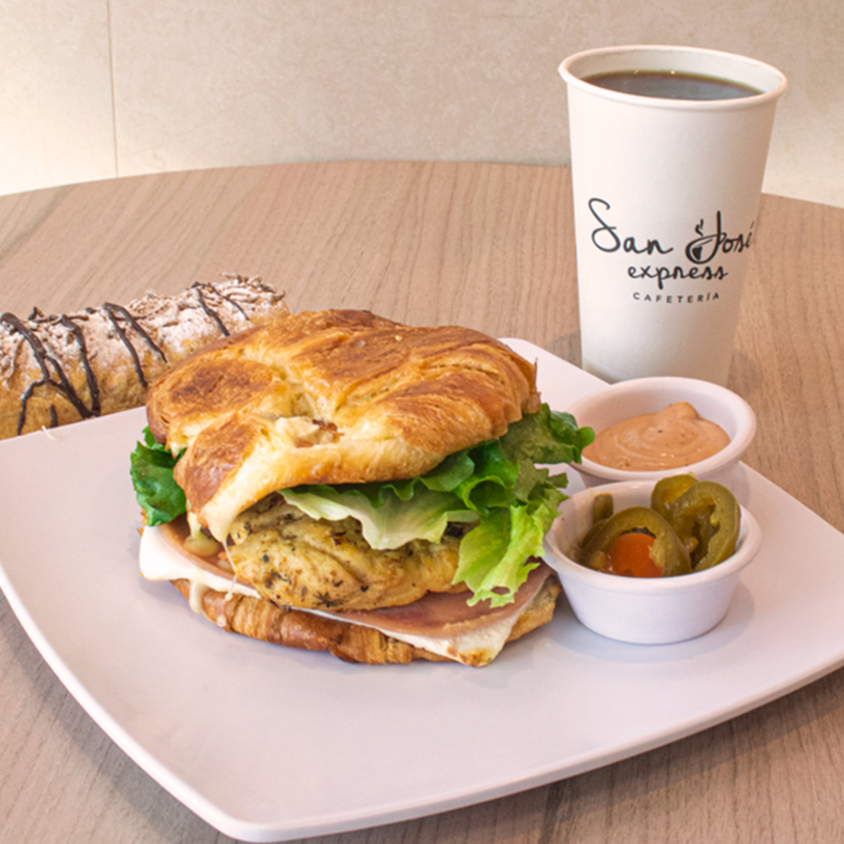 Delicioso croissant con pechuga de pollo a la plancha, queso panela, manchego y jamón acompañado de tomate, cebolla, lechuga italiana con aderezo jalapeño.