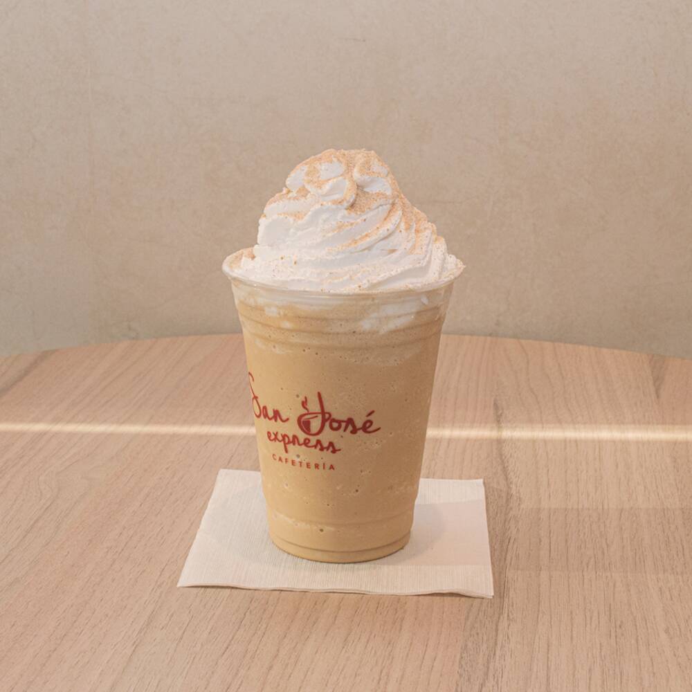 473ml (16oz). Bebida frappé café mezclado con jarabe de caramelo, decorado con crema batida y topping de caramelo.