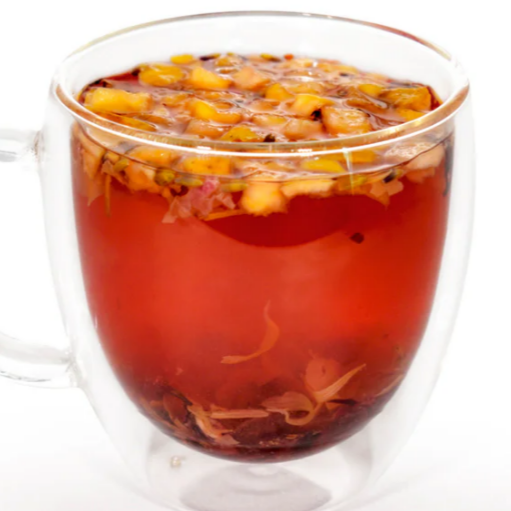 473ml (16oz). Té con frutillas comestibles de manzana, arándano, uva pasa, fresa, mora azul, flor de jamaica, pétalos de rosa, almendra y nuez.