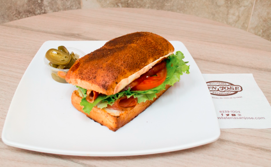 Pan tipo Panini con jamón de pavo y cerdo, salami, pepperoni, con queso philadelphia y panela, tomate, lechuga con aderezo chipotle.