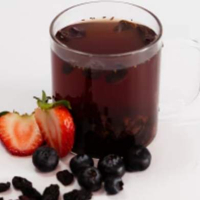 473ml (16oz). Té con frutillas comestibles de manzana, arándano, uva pasa, fresa, mora azul, flor de jamaica, pétalos de rosa, almendra y nuez.