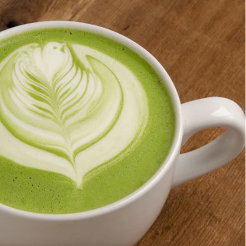 473ml (16oz). Hojas molidas de té verde finamente mezclado con leche caliente ya endulzado.