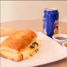 Pan tipo Panini con 4 variedades de queso: manchego, philadelphia, panela y parmesano, acompañado de espinaca y champiñones salteados con especias.