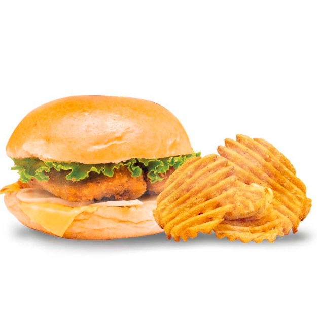 Deliciosa hamburguesa con pan con ajonjolí, pechuga de pollo empanizada, queso amarillo americano y oaxaca, pepinillos con lechuga, tomate y cebolla acompañada con papas crisscut sazonadas.