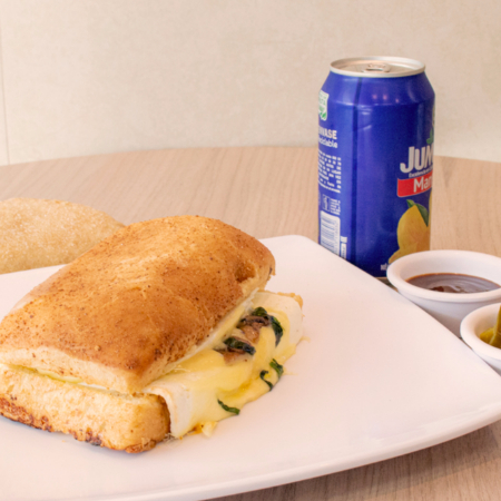Pan tipo Panini con 4 variedades de queso: manchego, philadelphia, panela y parmesano, acompañado de espinaca y champiñones salteados con especias.