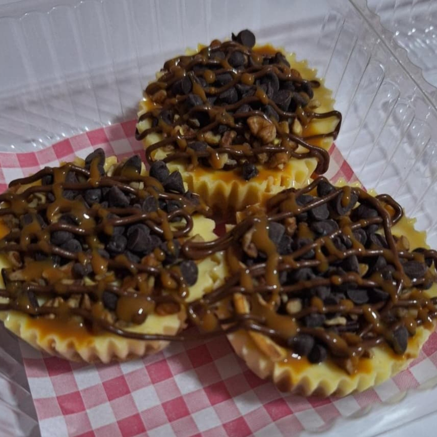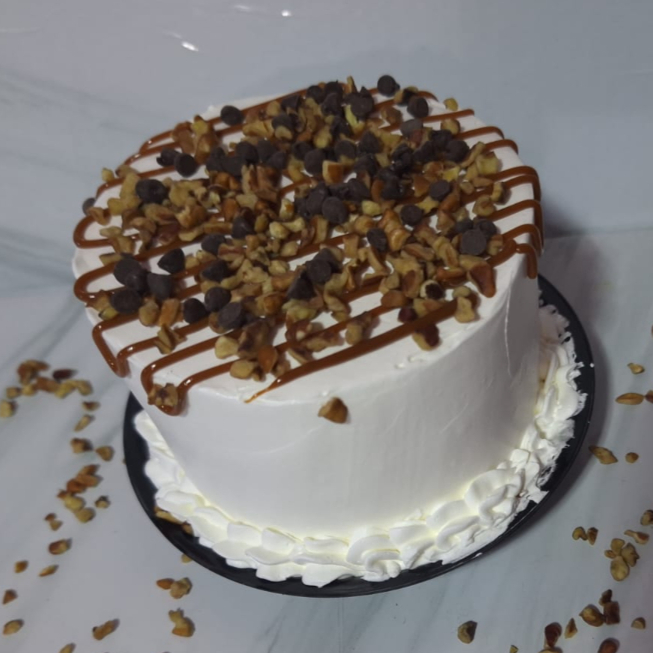 Elaborado con pan vainilla, semi húmedo relleno de Cajeta, decorado con Cajeta, nuez y chispas de chocolate