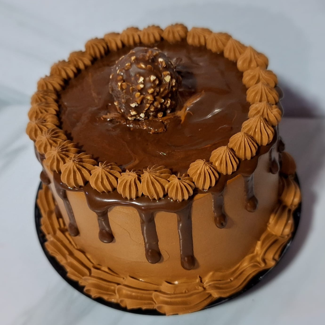 Elaborado con pan chocolate, Semi húmedo relleno de Nutella, Cubierto con Betún de Chocolate, Decorado con Nutella y Ferreros