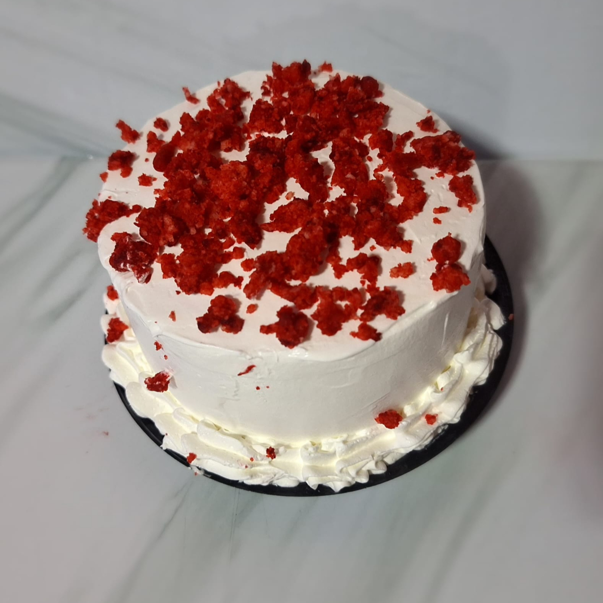 Elaborado con Red Velvet, pan seco, relleno y cubiertos con Betún de Queso Crema