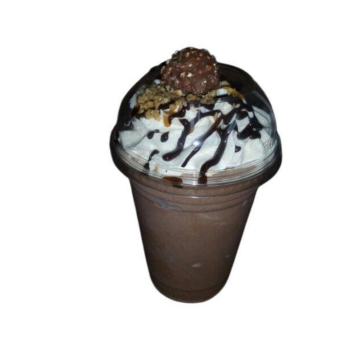 473ml (16oz) Frappé sin cafe, con jarabe de chocolate, nutella, decorado con crema chantilly, trozos de nuez , lineas de nutell y un chocolate ferrero