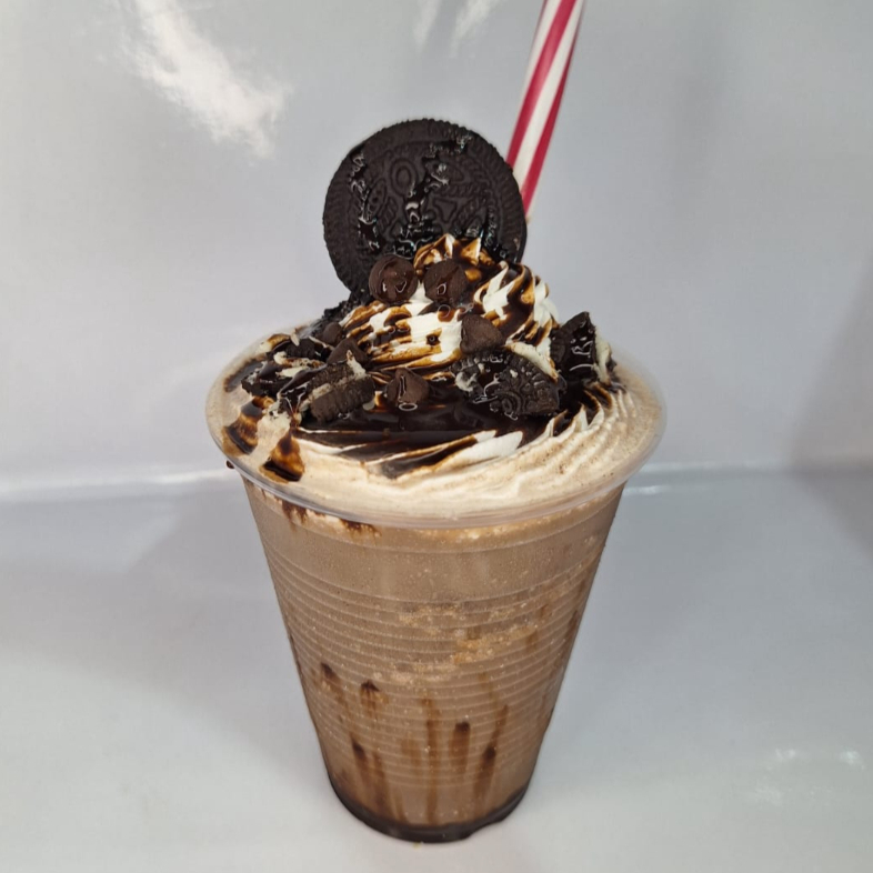 473ml (16 oz), Frappé sin café, con jarabe de chocolate, galleta oreo, decorado con Crema Chantilly, Nutella una galleta oreo