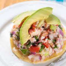 Tostada ceviche mixto de camaron y tilapia frescos y pico de gallo curtido en jugo de limon. con abanico de aguacate.