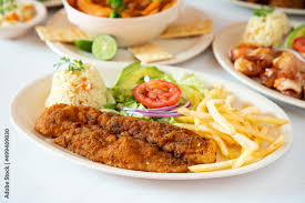 Filete de pescado empanizado, crocante y jugoso, papas, potacio, arroz y ensalada.