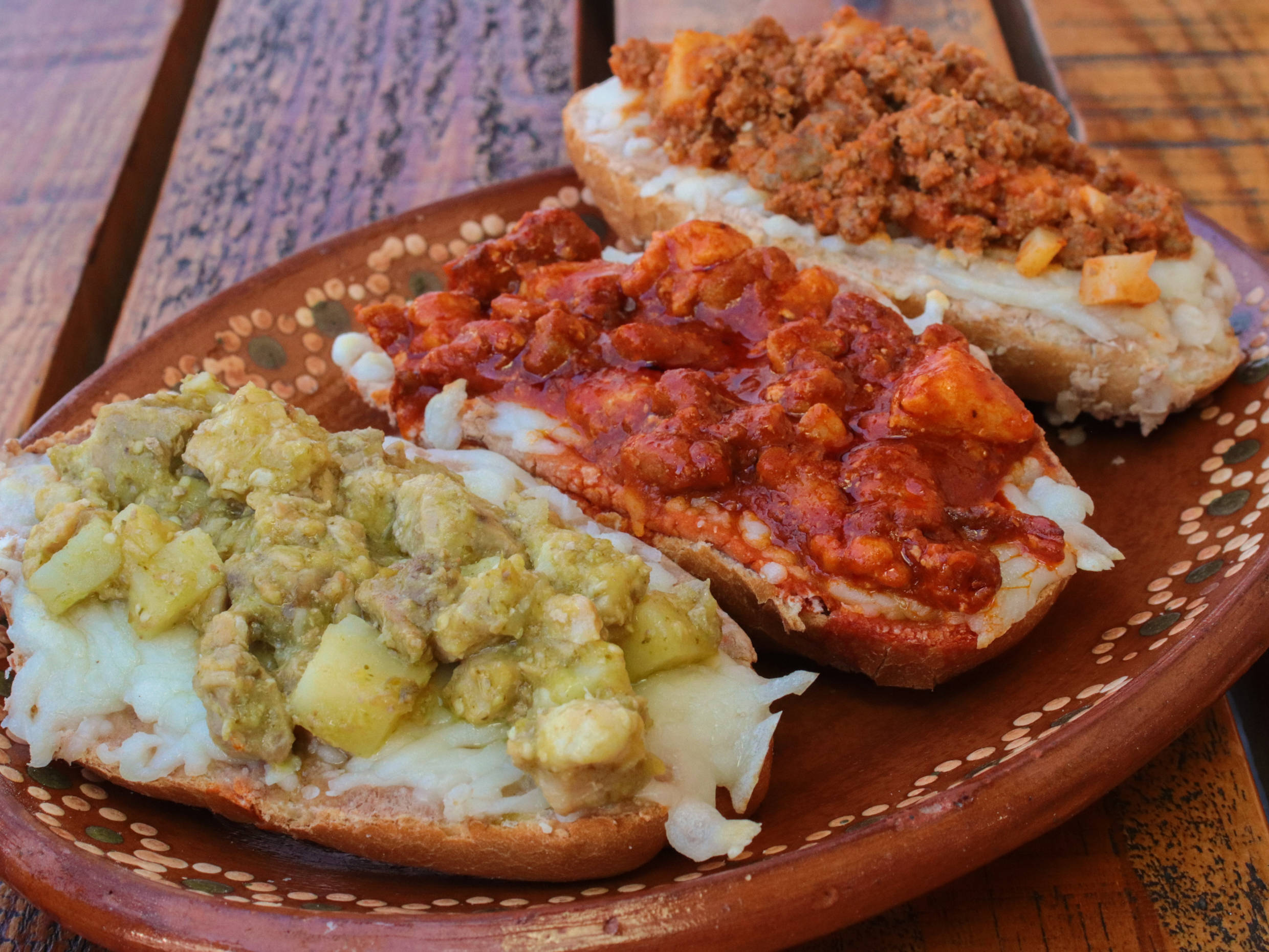 Tres piezas de molletes con guiso