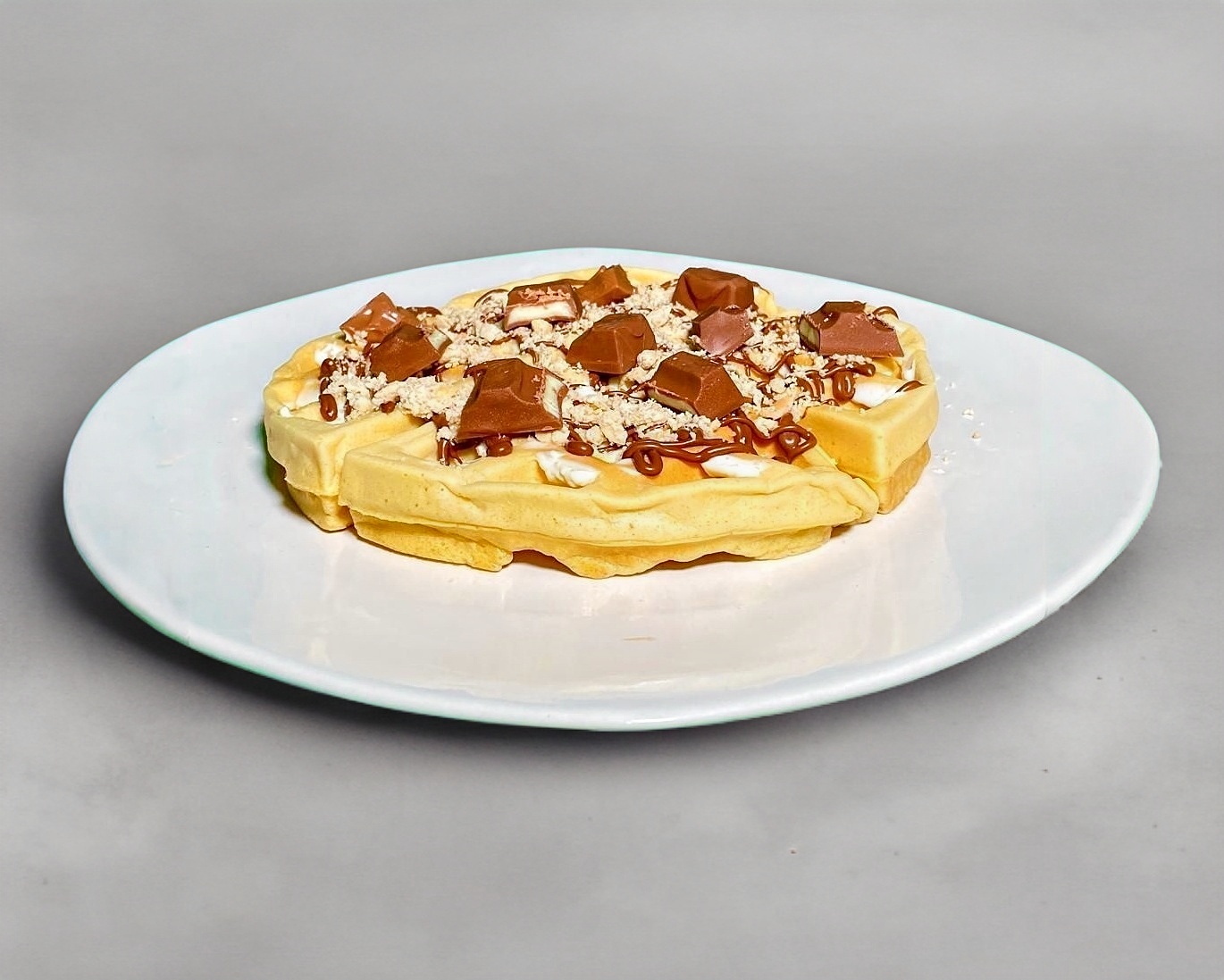Expresso con Leche entera o deslactosada a elegir 12oz (354.88ml) acompañado de un waffle con dos toppings