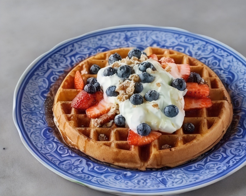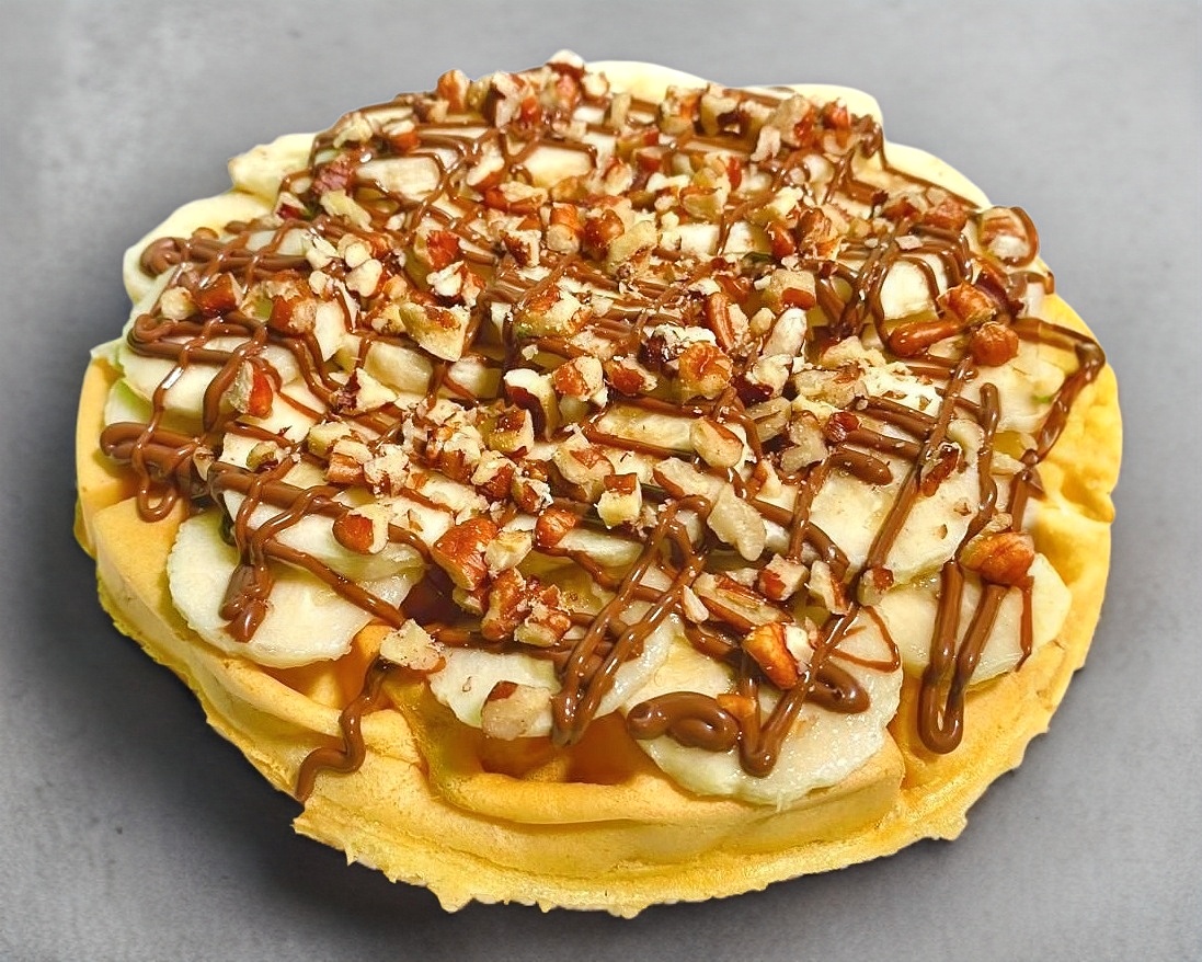 Delicioso Waffle grande redondo con nuez cortada en trozos grandes con platano y Nutella