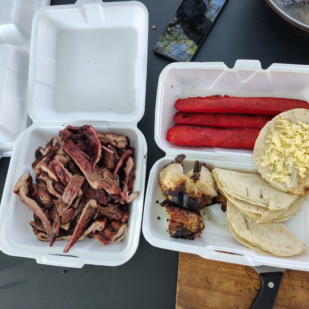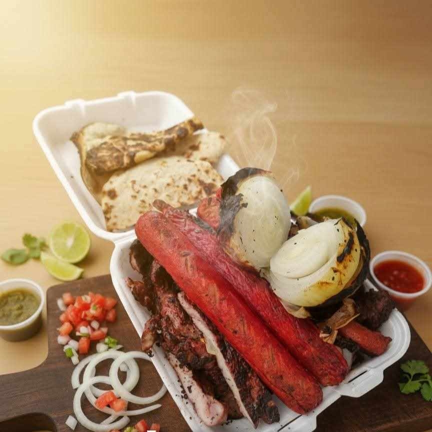 medio kilo de carne asada 1 salchicha jumbo 2 quesadillas,1 tostada 1/2 cebolla ,tortillas,salsas