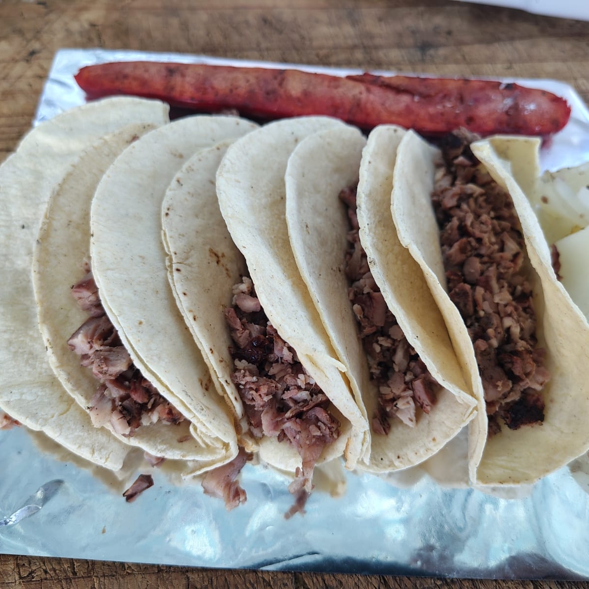 5 tacos de carne asada con cebolla asada 1/2 salchicha