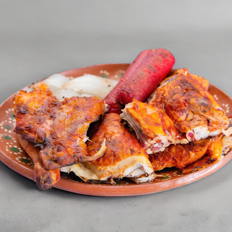 Un pollo asado (ocho piezas) salsa, totopos, una pieza de salchicha, un paquete de tortilla de maíz y cebolla asada.