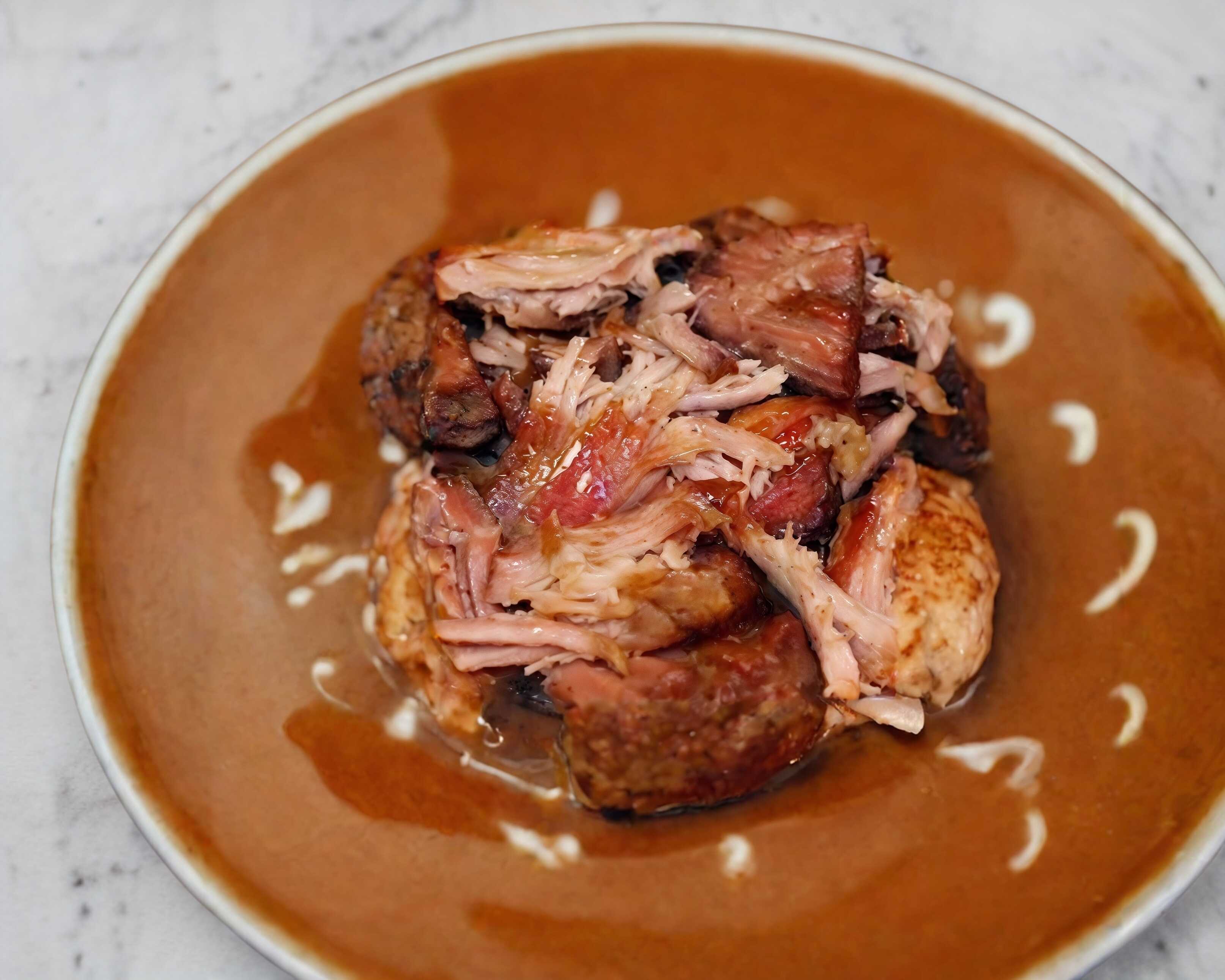 1 kg, 2 salchichas asadas, 2 empalmes, 1/2 L frijoles charros, cebolla asada, salsa roja y tortillas de maíz.