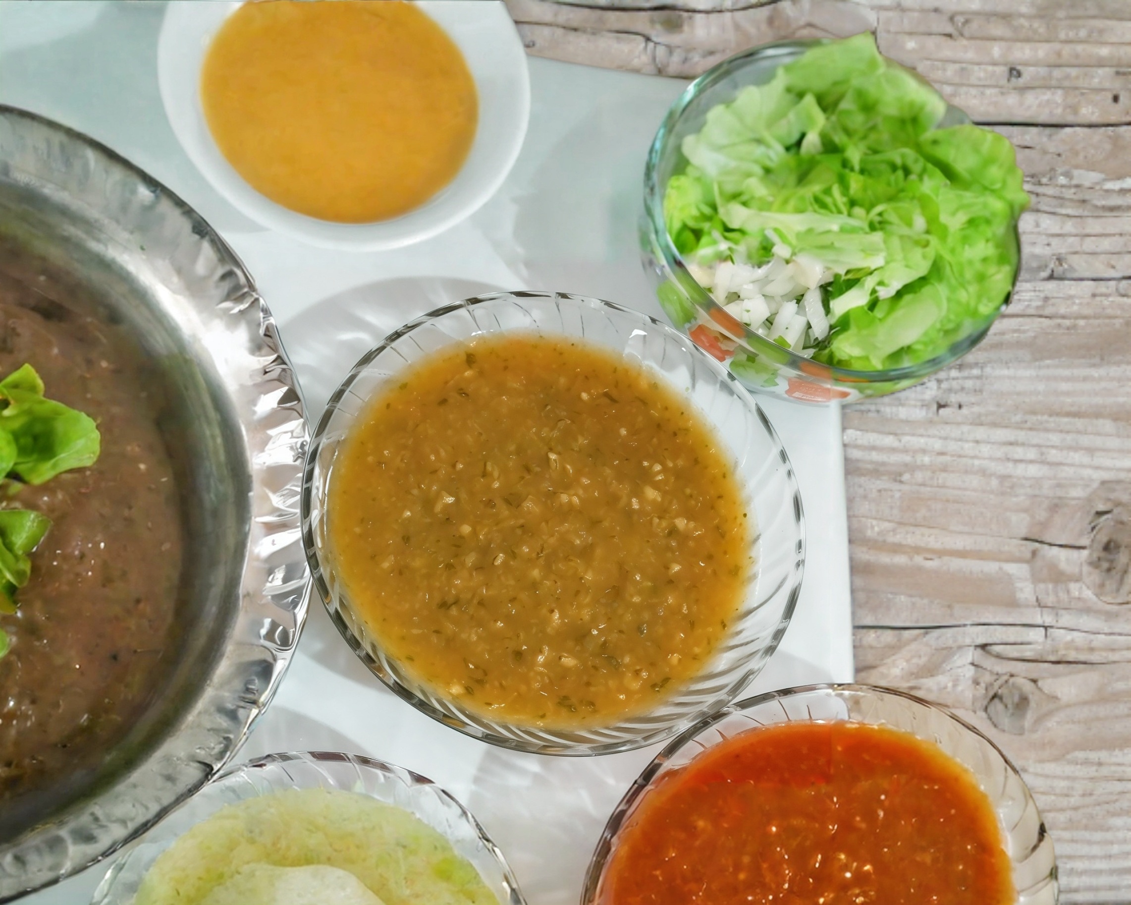 limones, salsa roja, verde, cilantro con cebolla, pico de gallo, cebolla morada, piña y habanero.