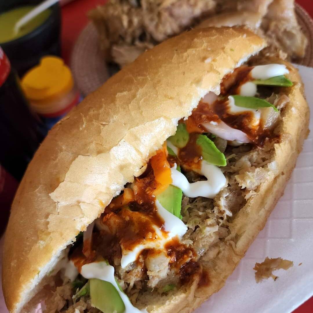 Carnita, Aguacate, Lechuga, Cebolla, Tomate y Crema.