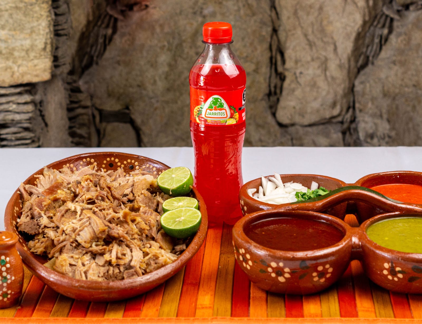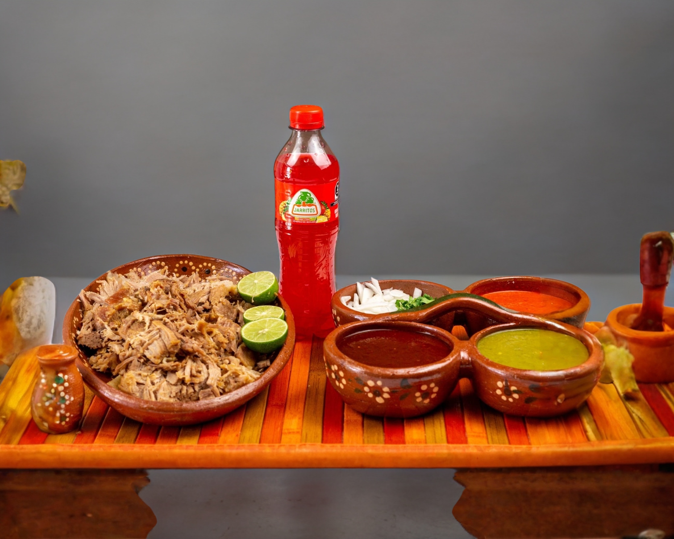 1/2 Kilo de Carnitas, 1 Refresco de 2 Lt Incluye Salsa, Tortillas,Limón, Tostitas, Cebolla,Cilantro.