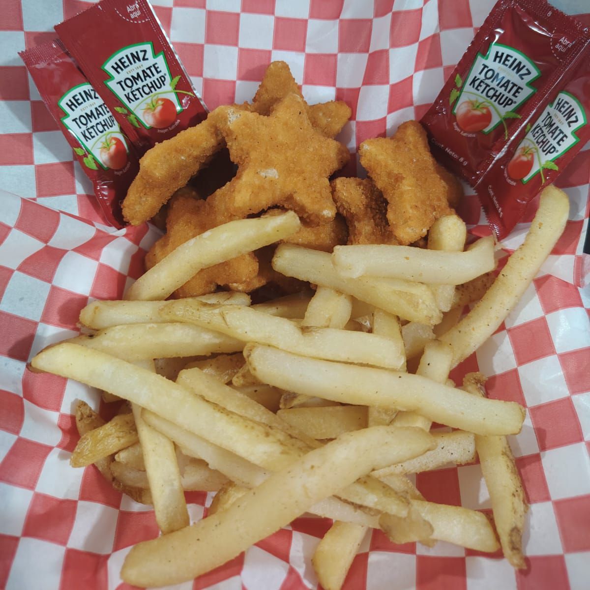 Nuggets de estrella con papas a la francesa acompañado con catsup y queso