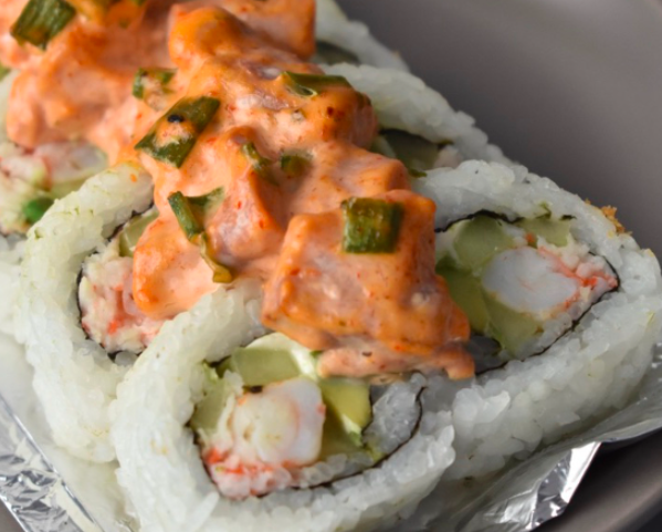 Queso crema, aguacate, pepino, surimi, atún horneado, aderezo mayo-sriracha, cebollín, soya dulce y shichimi. Acompañado de wasabi para que te animes a probarlo.