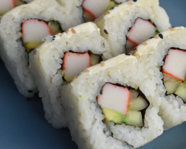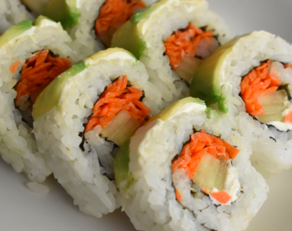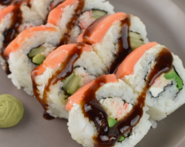 Queso crema, aguacate, pepino, surimi, salmón y soya dulce. Acompañado de wasabi para que te animes a probarlo.