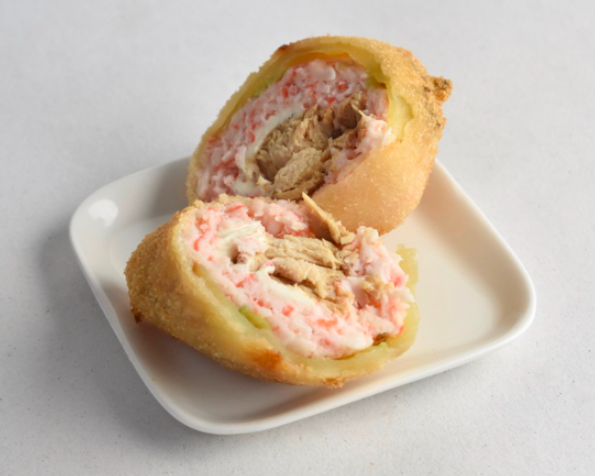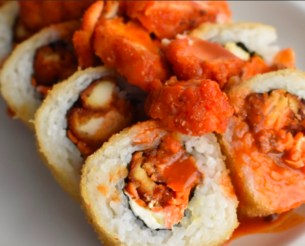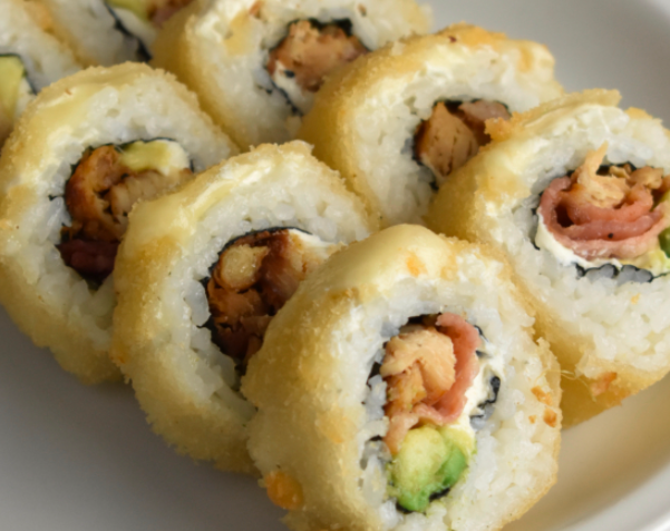 Arroz blanco, queso crema, atún frito, salmón frito, aderezo mayo-sriracha, aguacate, cebollín, soya dulce y shichimi.