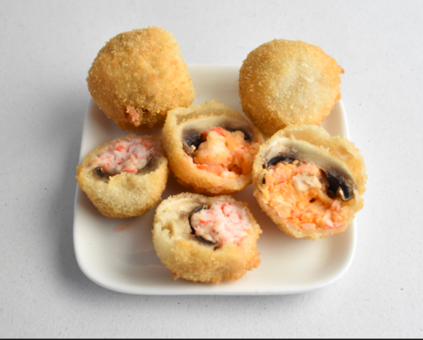 4 champiñones empanizados rellenos de tampico y spicy de tampico.