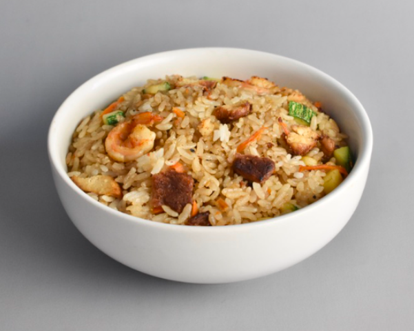 Arroz frito, zanahoria, calabaza, pollo, res y camarón.