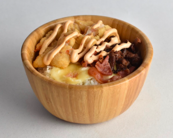 Arroz blanco, queso crema, queso manchego, tocino, res, camarones empanizados y mayo-chipotle.