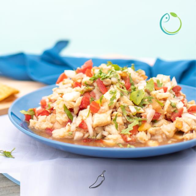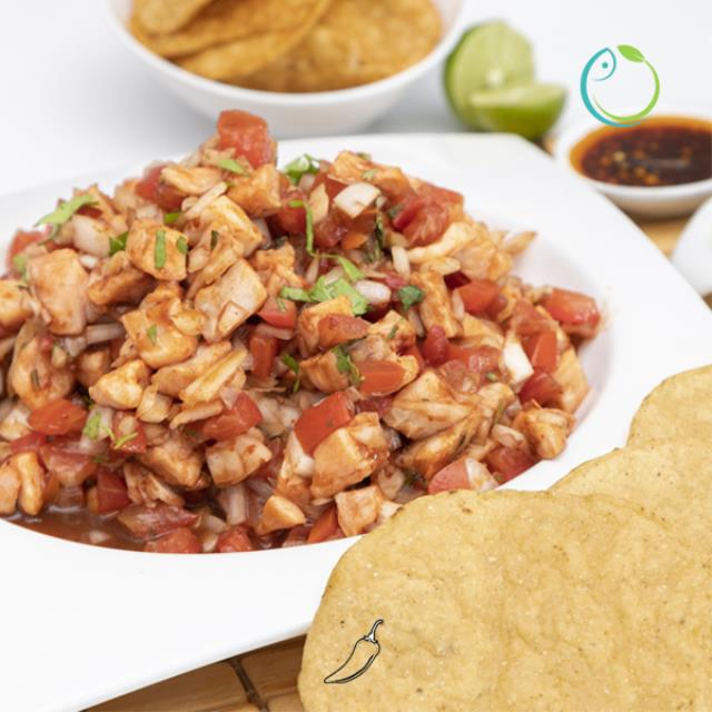 Ceviche con Tilapia en toques cítricos. Bañado en salsa estilo pacífico, cebolla, cilantro y jitomate. Incluye tostadas y aderezo CL. Picante BAJO