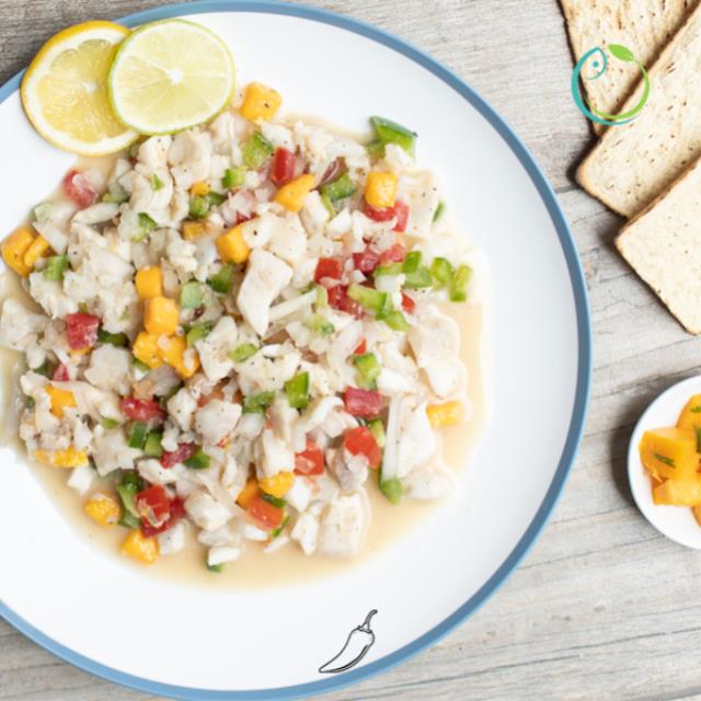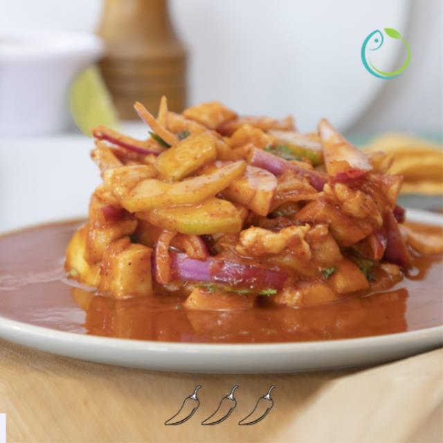 Base de tilapia fresca, cebolla, mango, pimiento verde, tomate, cilantro y su exquisita leche de tigre. Incluye tostadas y aderezo CL. Picante BAJO