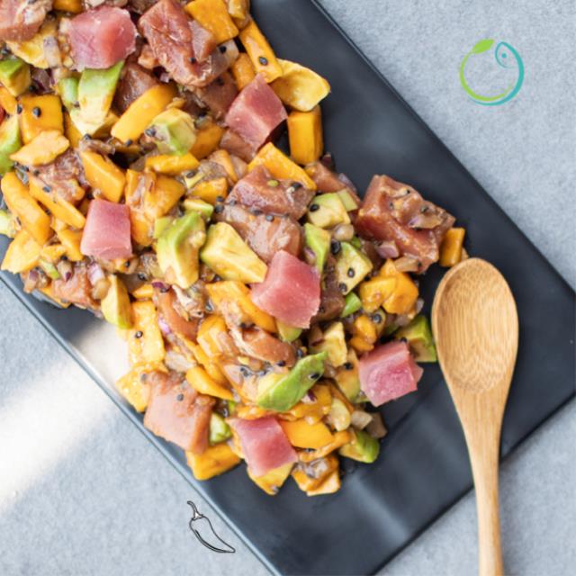 Cubos de atún-mango bañados en salsa oriental y naranja. Además aguacate, cebolla morada, ajonjolí y cebollín. Con tostadas y aderezo CL. Picante BAJO