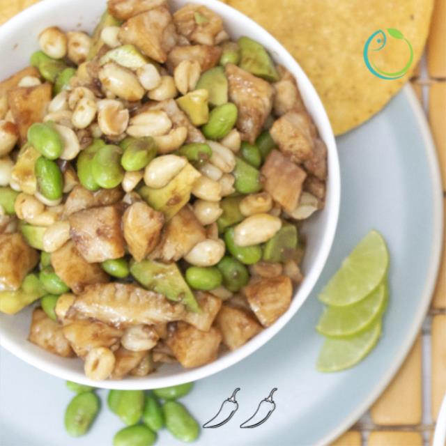 Pescad, edamame y cacahuate, la mejor combinación, un toque del medio oriente, elote tierno y aguacate. Incluye tostadas y aderezo CL. Picante MEDIO