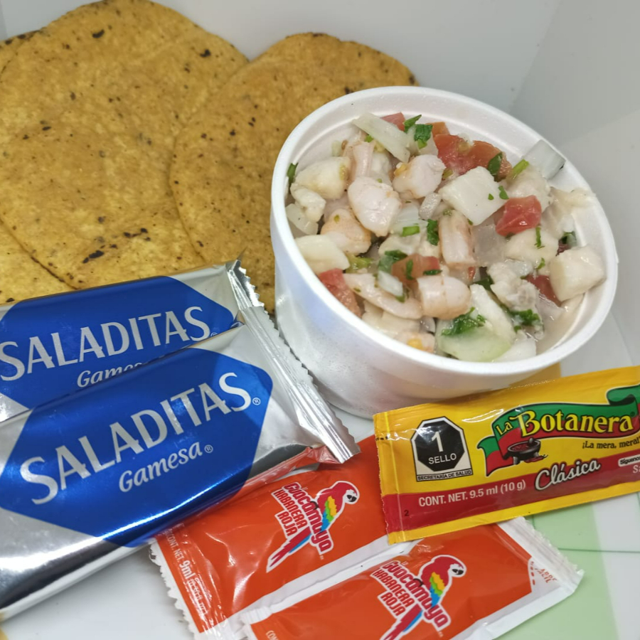 Ceviche fresco de pescado y camarón, curtido en limon con chile , tomate, cebolla y cilantro preparado al momento. Incluye tostadas, galletas y salsas.