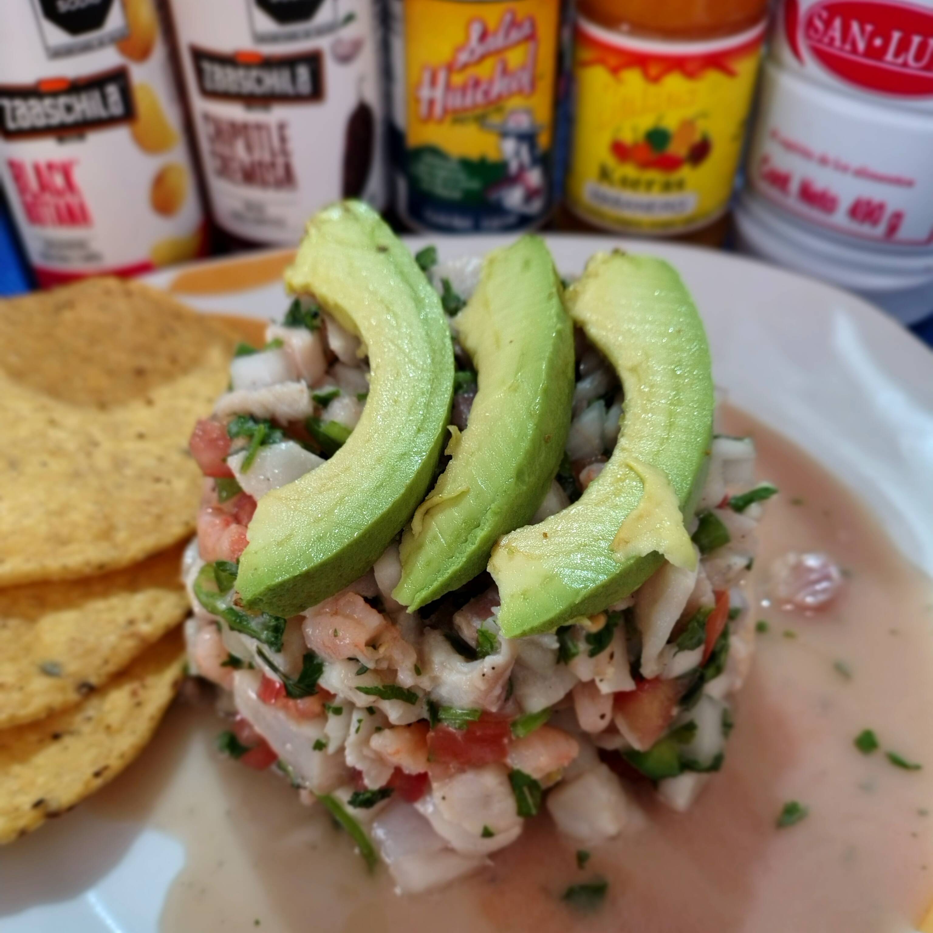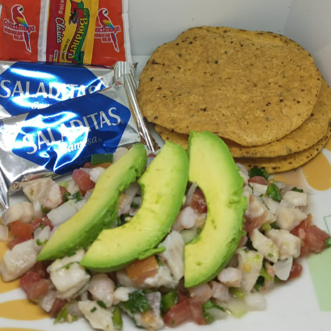 Ceviche fresco de pescado y camarón, curtido en limon con Aguacate , chile , tomate, cebolla y cilantro preparado al momento. Incluye tostadas, galletas y salsas.