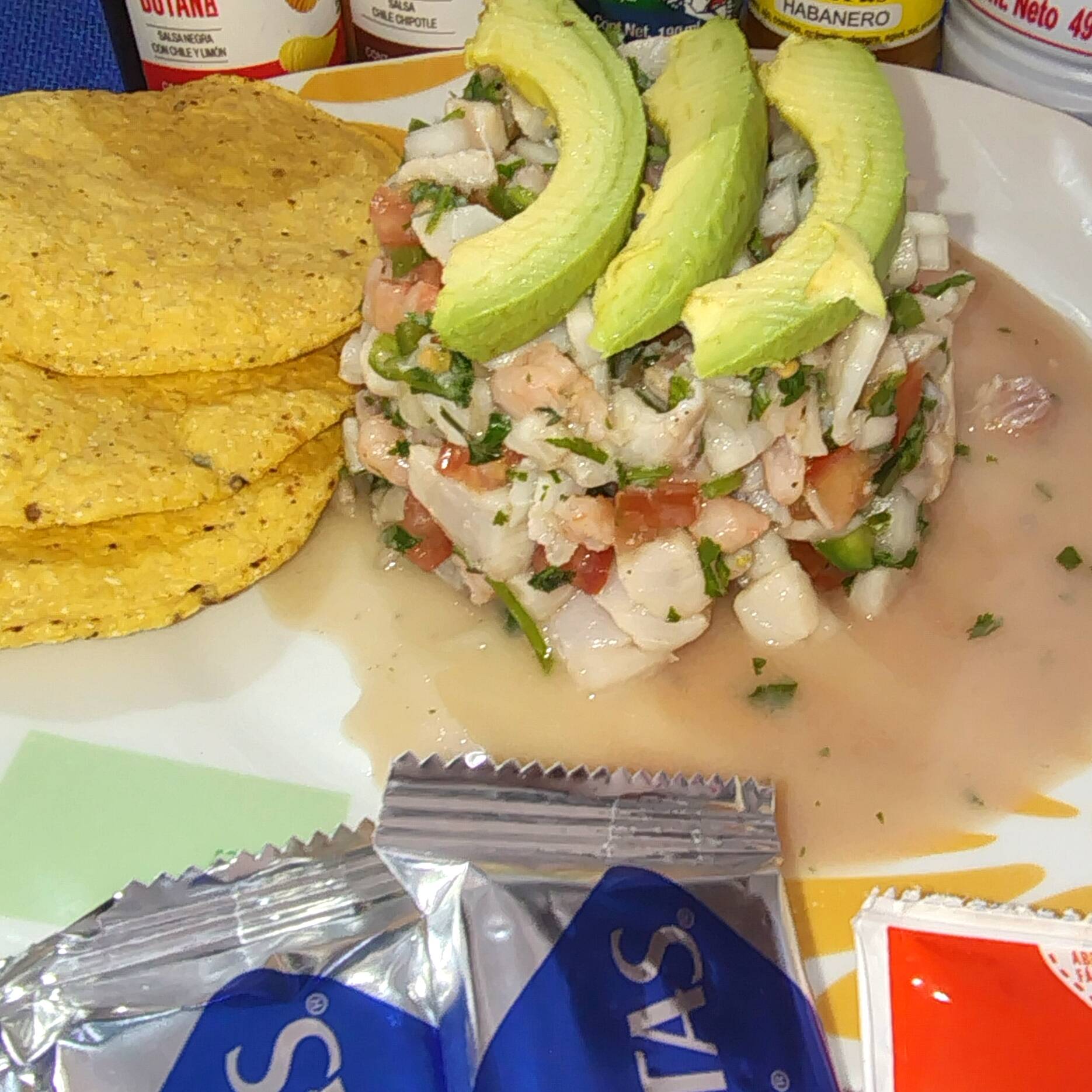 eviche fresco de pescado y camarón, curtido en limon con Aguacate, chile , tomate, cebolla y cilantro preparado al momento. Incluye tostadas, galletas y salsas., Ideal para 3 o 4 personas