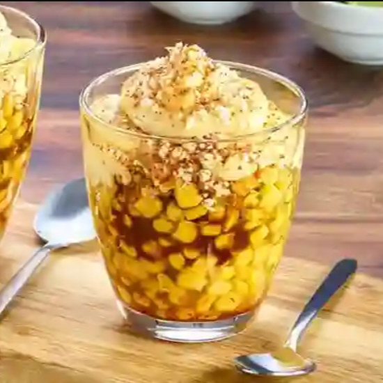 Elote desgranado preparado con queso, mayonesa, chile, queso amarillo y limón.