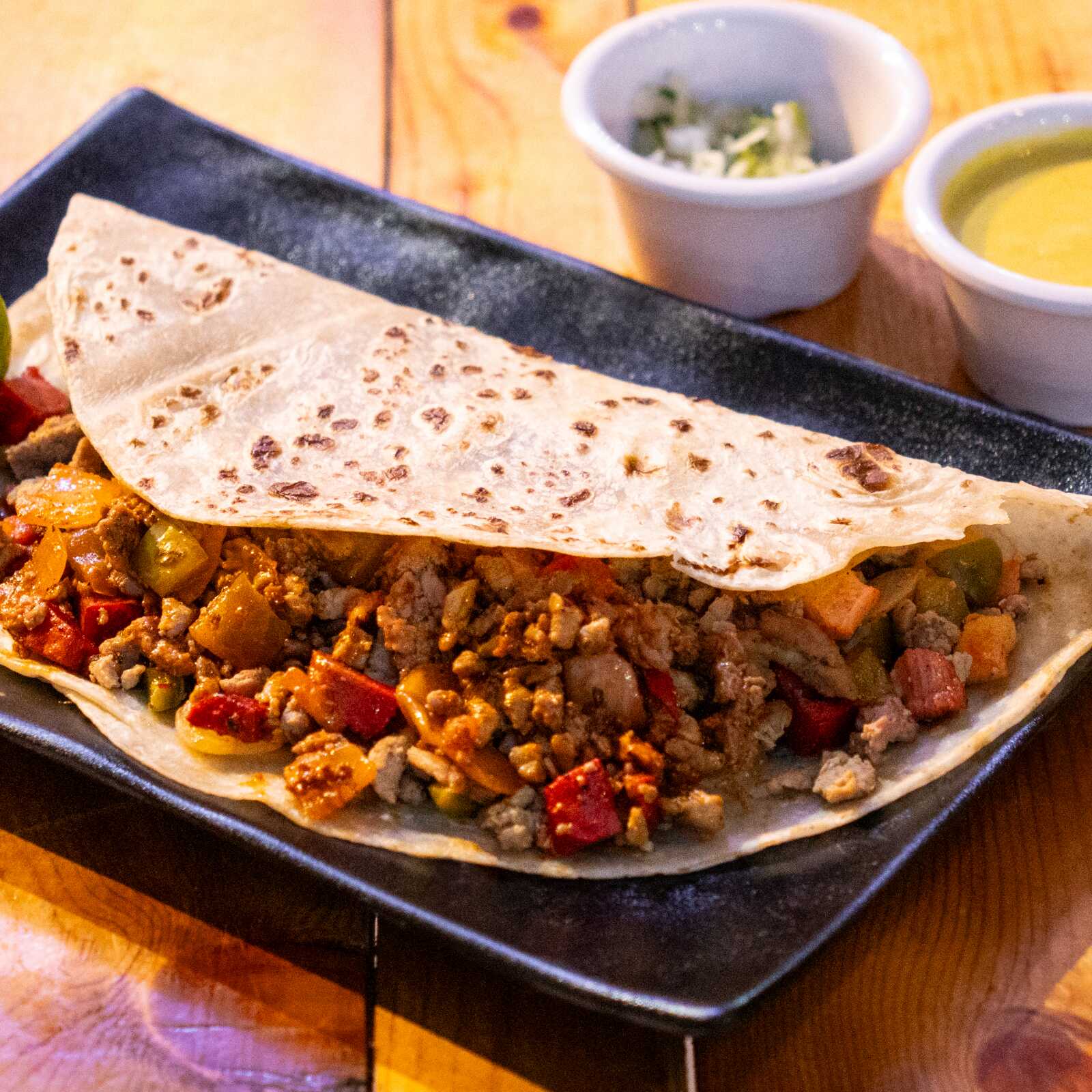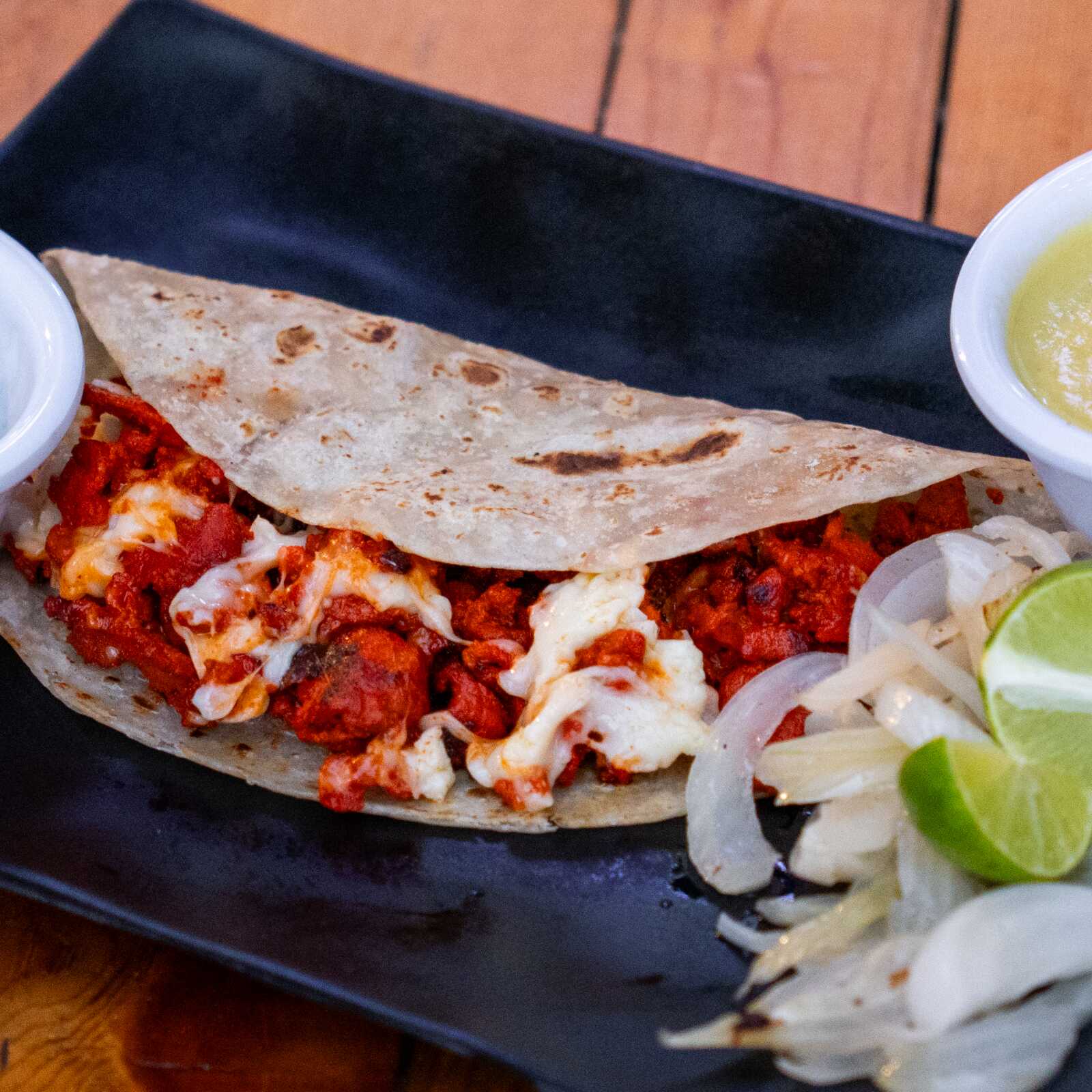 Tortilla de 30 cm relleno de discada con queso asadero, además de champiñones salteados.