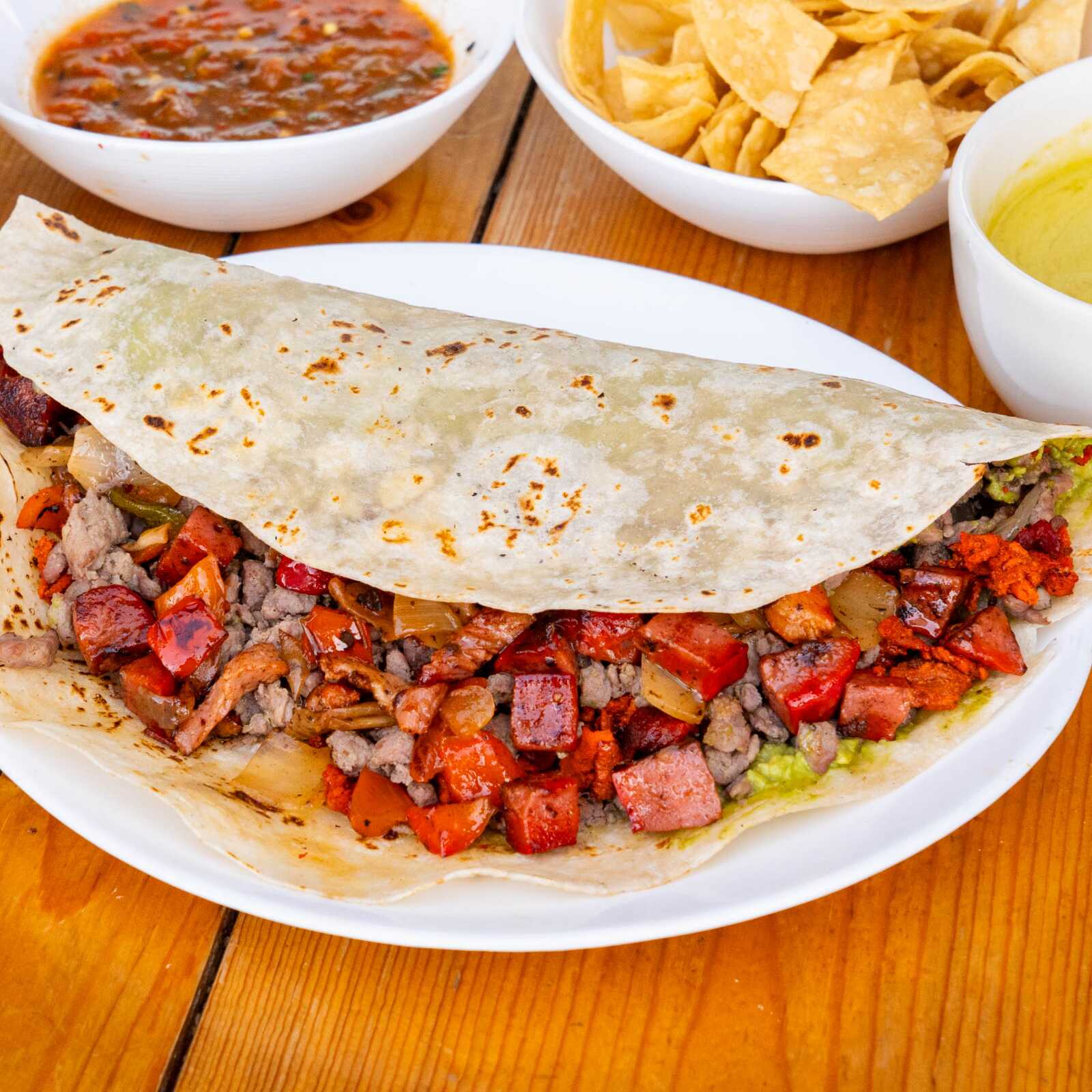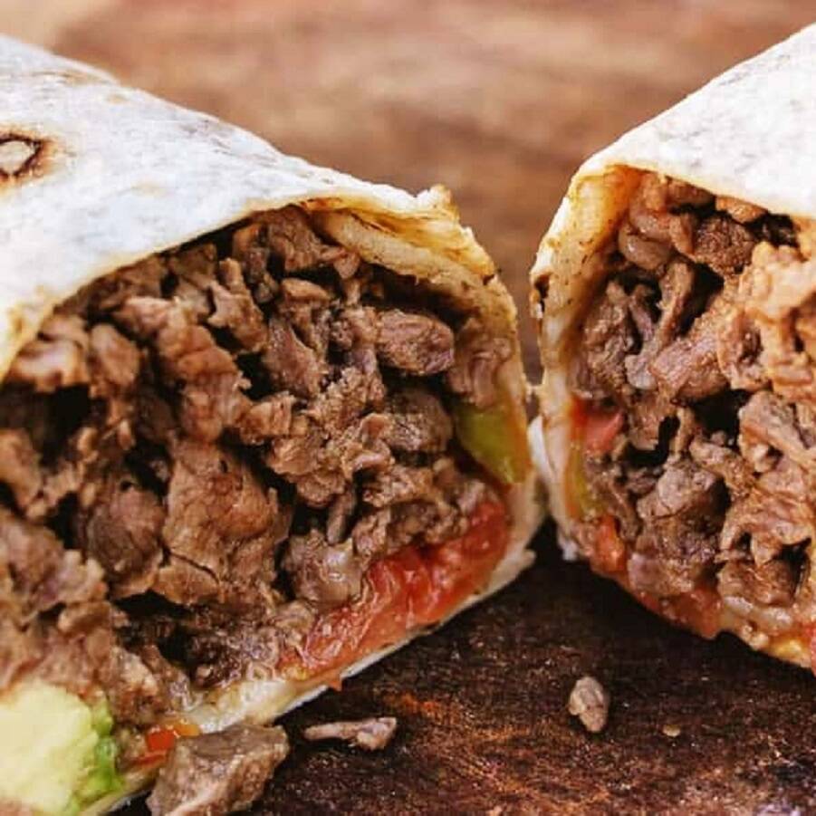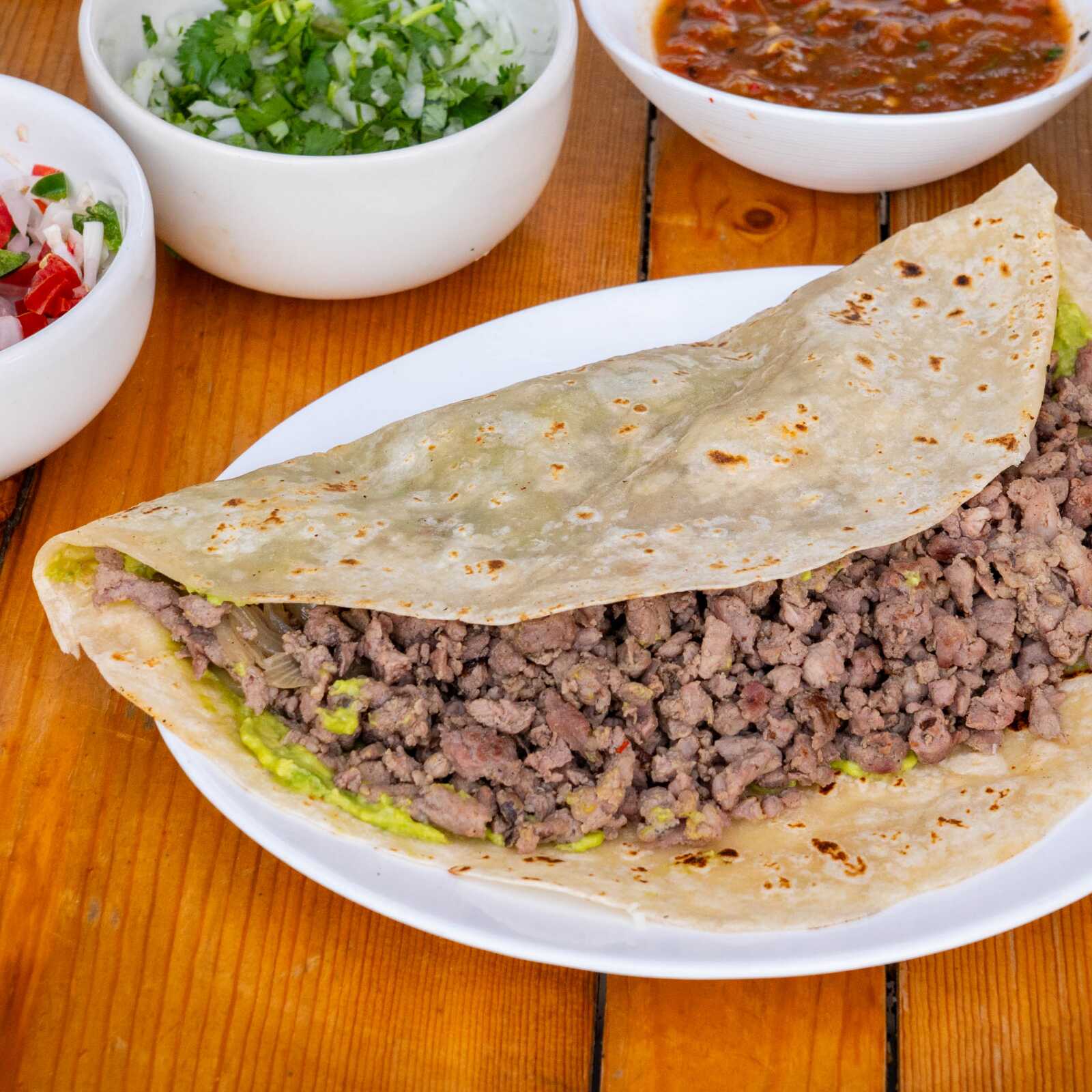 Tortilla de 30 cm rellena de suave sirloin con guacamole, tomate y cebolla asada. Además de frijoles refritos.