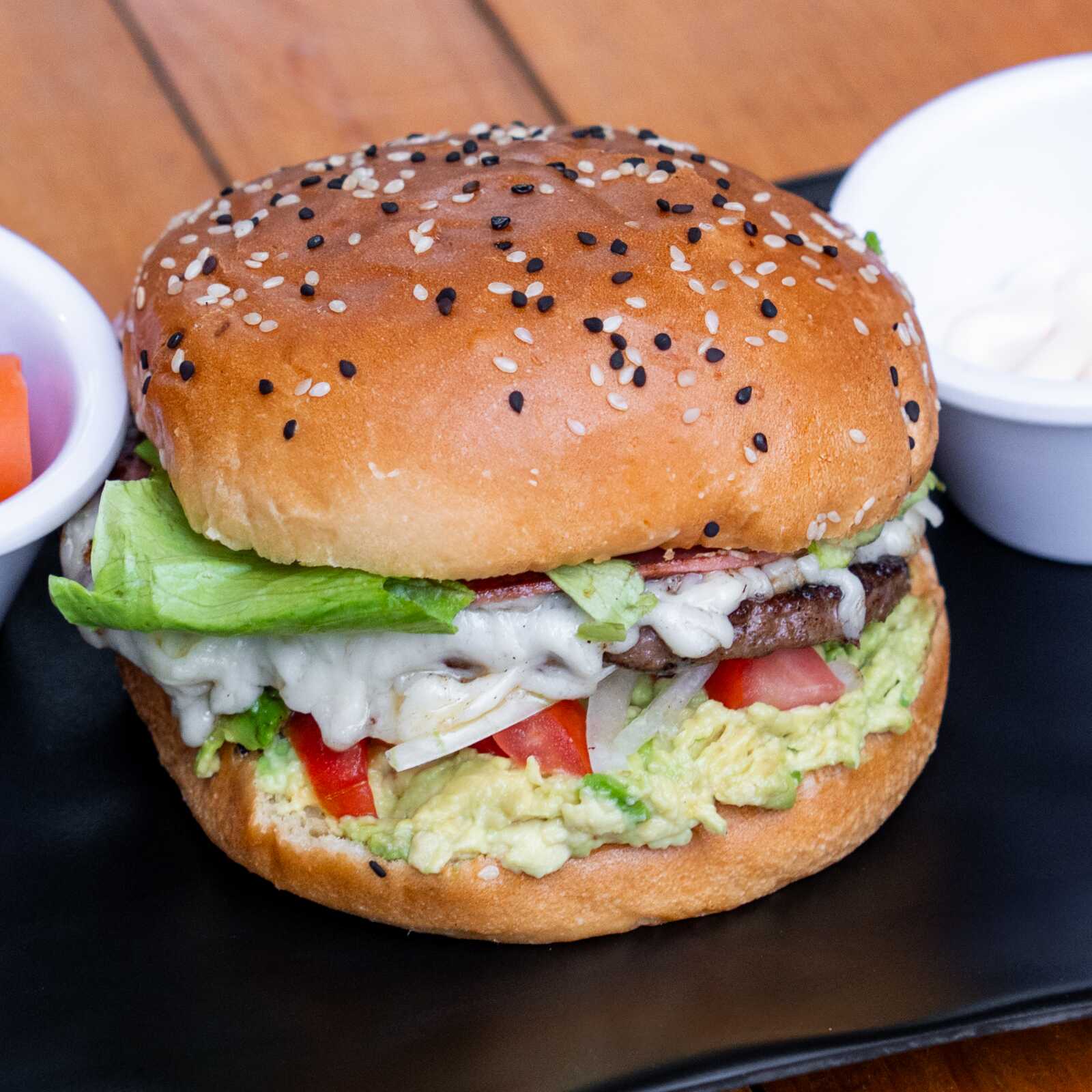 Tortilla de 30 cm rellena de suave sirloin con guacamole, tomate y cebolla asada. Además de tocino frito.