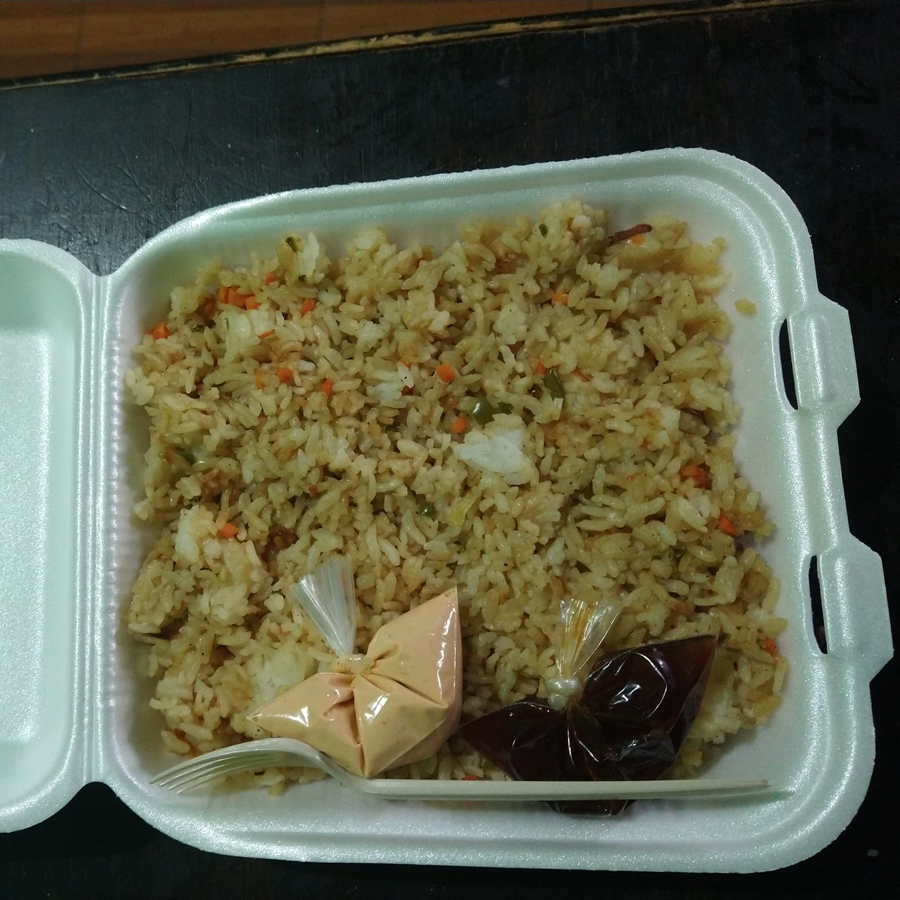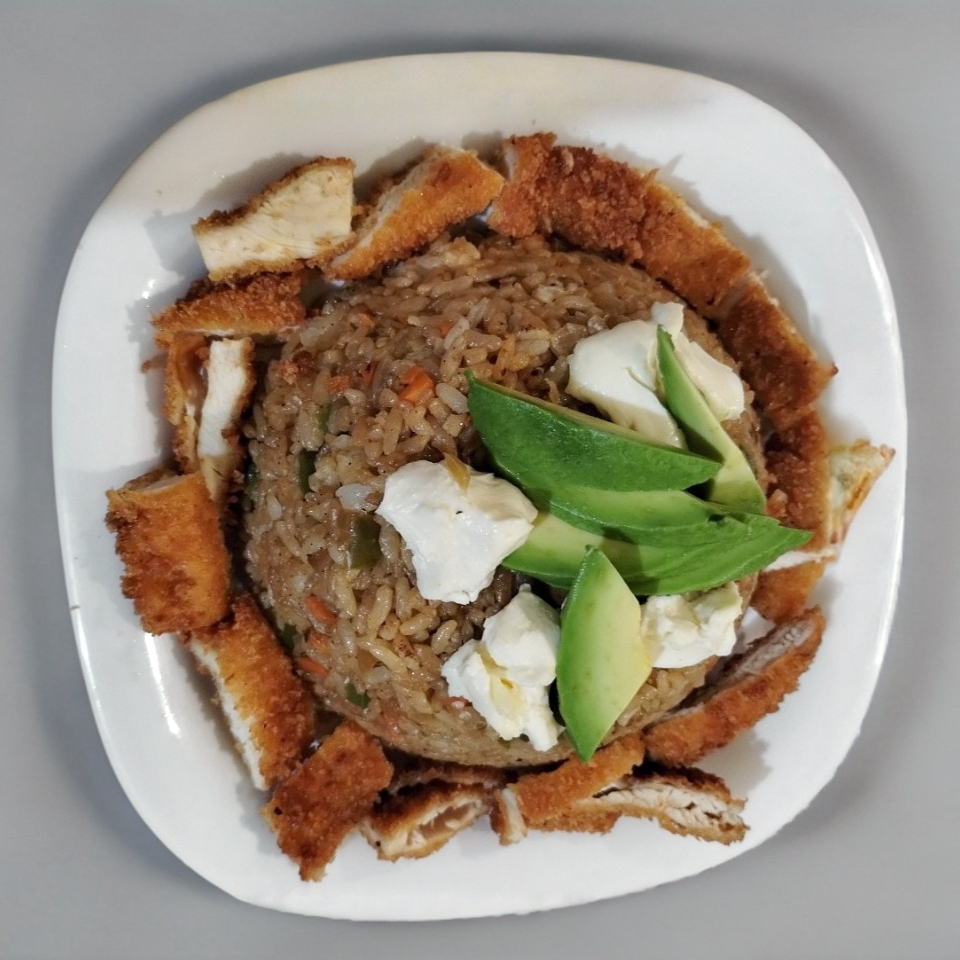 Arroz frito con verduras acompañado con pollo empanizado,chipotle y chile de árbol,