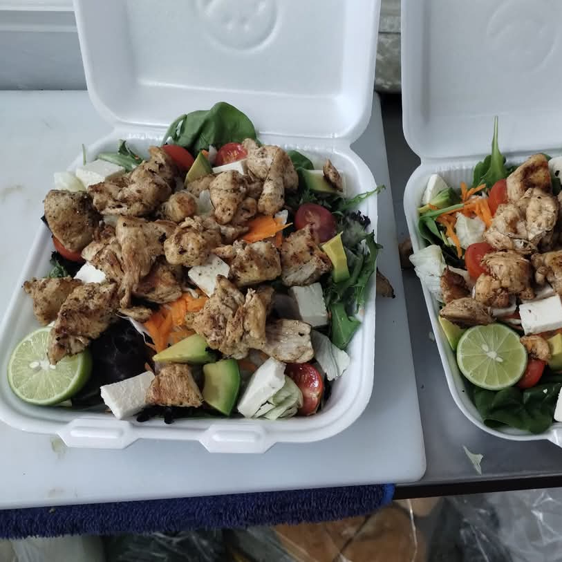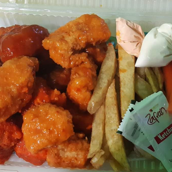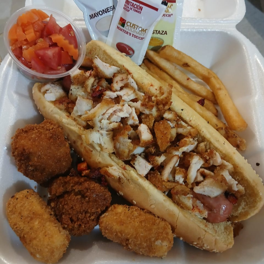 Salchicha de pavo,pollo empanizado,2 boneles,2 dedos de queso,papas,verduras y aderezos.