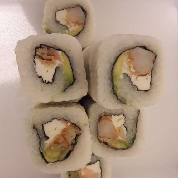 6 Sushis de camarón Filadelfia ,aguacate ,soya y chipotle