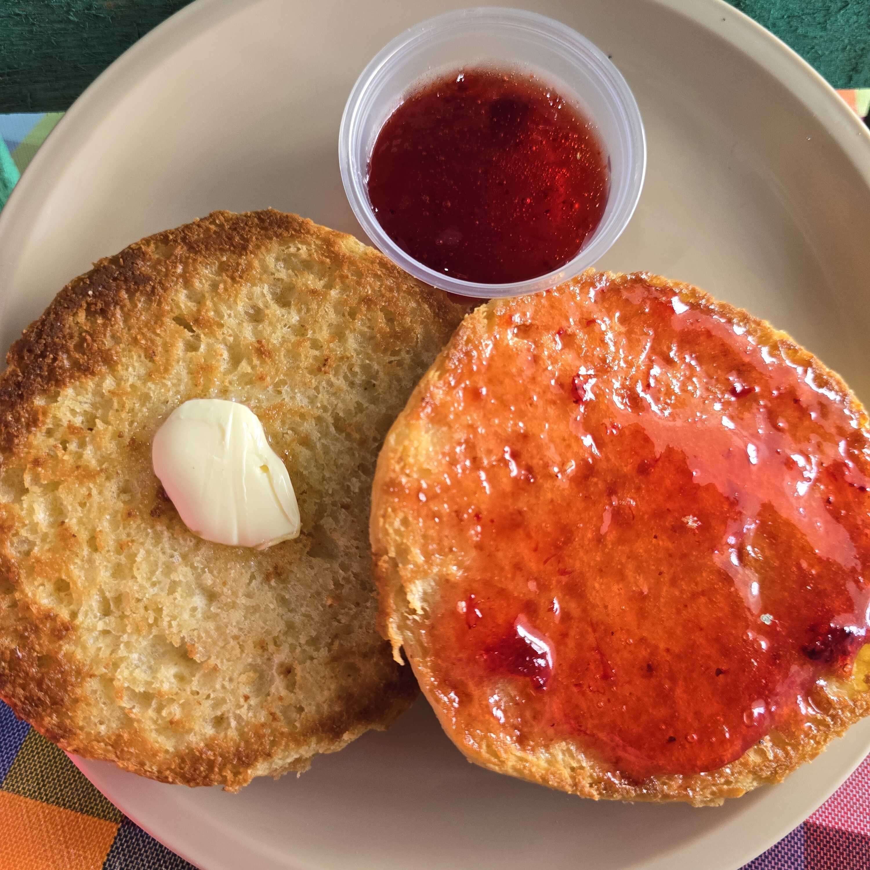 Tostado con mantequilla y acompañado de mermelada de fresa