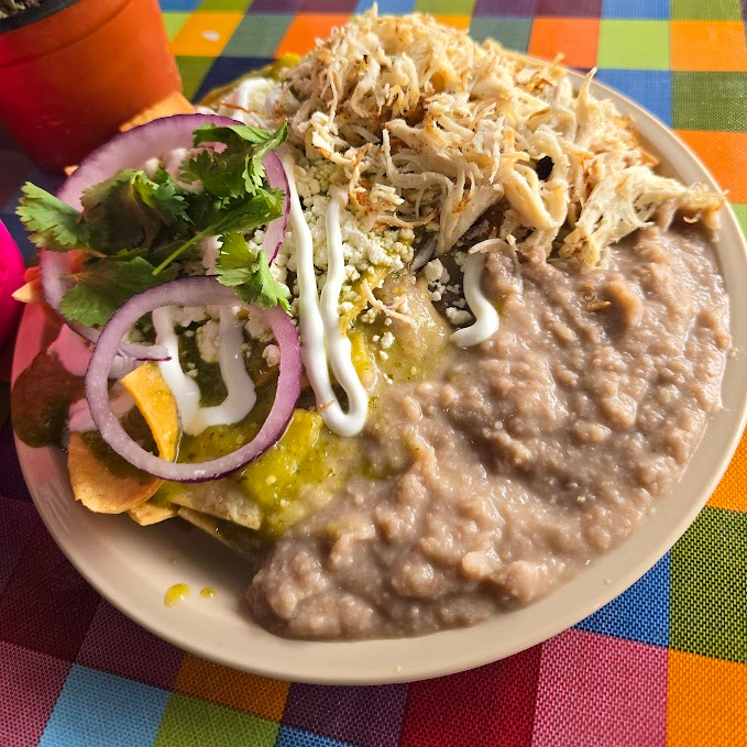 Totopos recién hechos, bañados en salsa verde con queso panela, crema, cebolla morada y cilantro. Acompañados de frijoles refritos