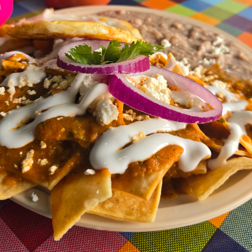 Totopos recién hechos, bañados en salsa roja con crema, queso panela y cebolla morada. Acompañados de frijoles refritos
